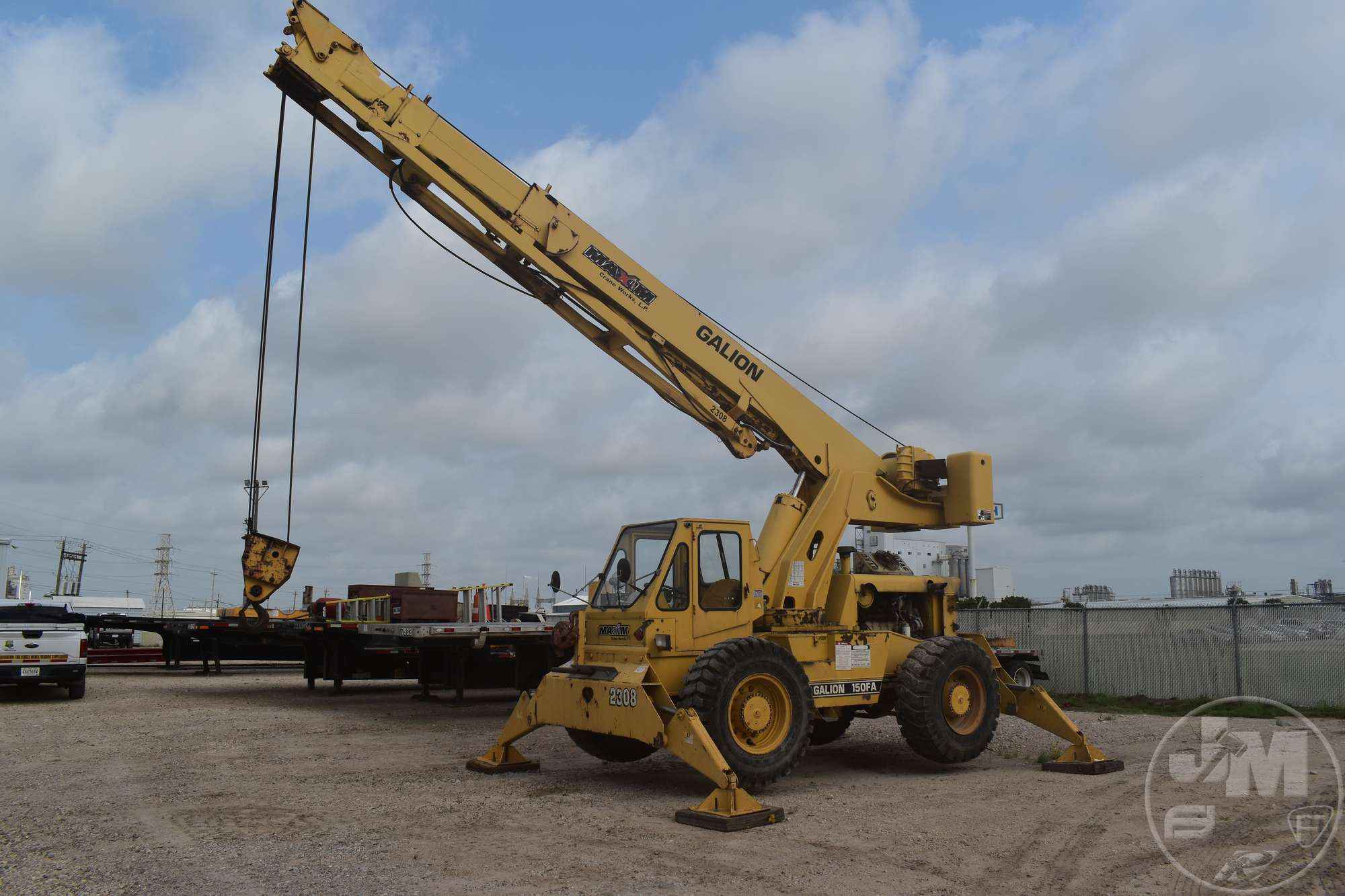 GALION ROUGH TERRAIN CRANE, GALION 150FA - 15 TON DOWNCAB ROUGH TERRAIN CRANE EQUIPPED WITH A 60' 3 SECTION MAIN BOOM, 22' JIB, BLOCK, BALL, ANTI-TWO BLOCK, 4X4, ALL WHEEL STEER, CAB, AC, HOUR METER READS: 3289, **NOT A TITLED ITEM** **BUYER IS RESPONSIBLE FOR LOAD OUT. ADDITIONAL SERVICE TO PREPARE EQUIPMENT FOR SHIPMENT OR LOADING TRUCKS WILL BE AN ADDITIONAL CHARGE** ***LOCATED IN FREEPORT, TX***