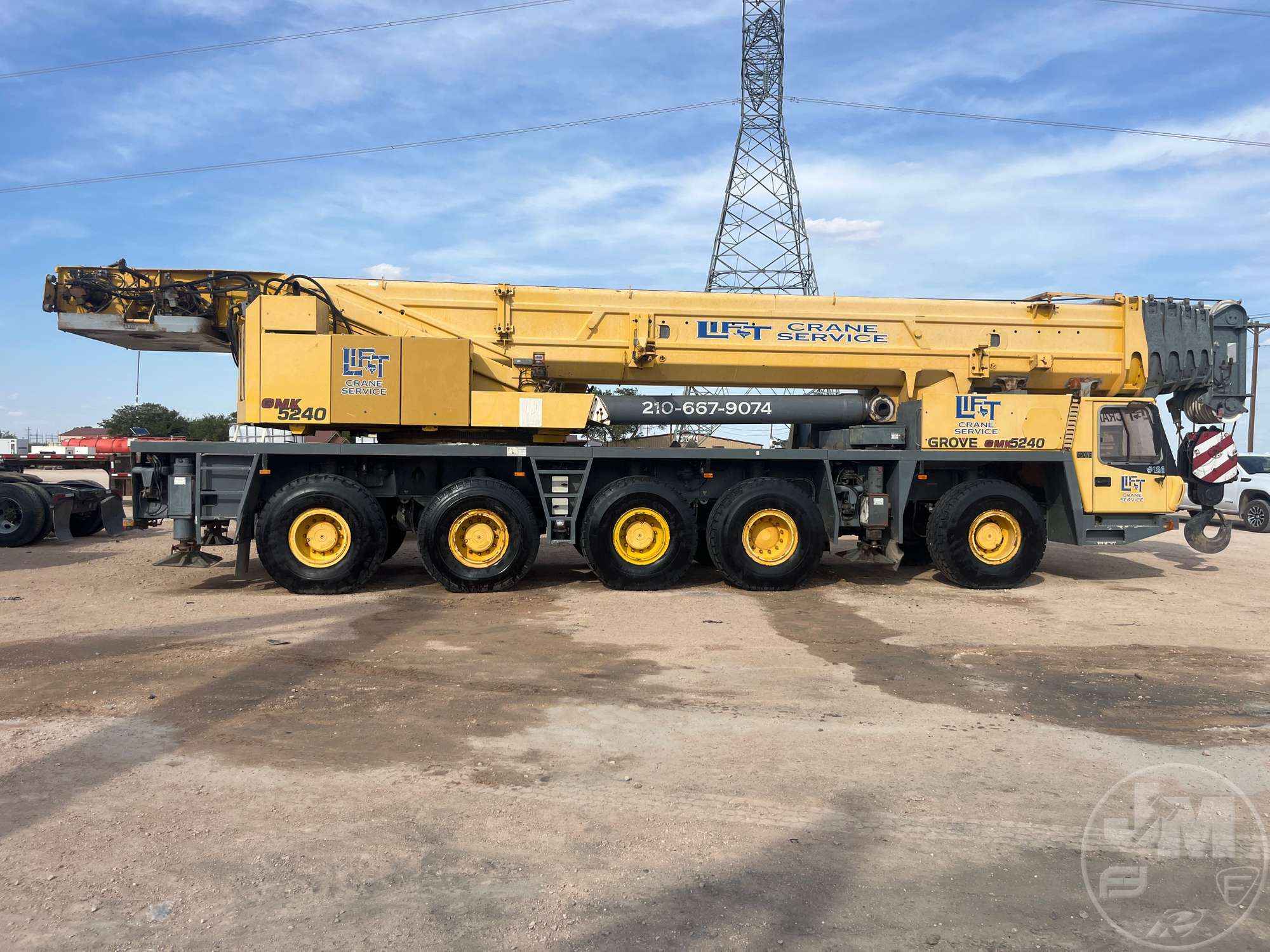 GROVE ALL TERRAIN CRANE, 2003 GROVE 5240, 240 TON CAPACITY, 8 CYL DIESEL, CAB, AC, RADIO, 197 FT MAIN BOOM, 5 SECTION BOOM, 154300 LBS COUNTERWEIGHT, SWINGAWAY JIB W/INSERTS, ROOSTER SHEAVE, AUX WINCH, BLOCK, BALL, ANTI-TWO BLOCK, ALL WHEEL STEER, MEGATRAK SUSPENSION, BOOM DOLLY PREPPED, HOUR METER READS 11384, ***LOCATED IN STANTON, TX***, ***COUTERWEIGHT & JIB LOCATED IN MIDLAND, TX*** ****NO TITLE, BILL OF SALE ONLY*******LOCATED IN STANTON, TX***