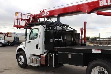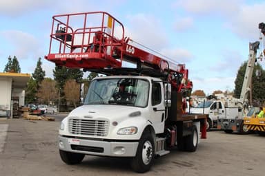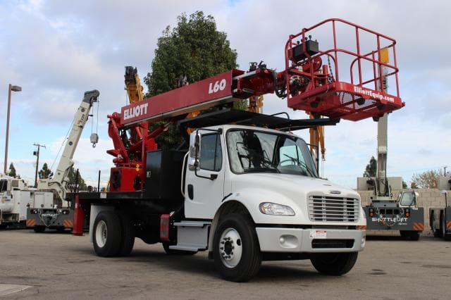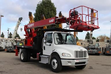 One New Elliott HiReach L60R having a 62’ working height. Basic unit includes base assembly supporting rear mounted rotating turret, hydraulically powered continuous rotation mechanism, oil reservoir mounted to truck frame, oil and manual hydraulic controls mounted to turret. Electronic proportional three stick remote controls on platform. Base mounted “MH†type hydraulically powered, individually controlled rear main outriggers an “A†secondary outriggers behind cab. Steel three section hydraulically telescoping boom with one double acting 6†lift cylinder plus a 3†piggyback extension cylinder. Exposed cable carrier to boom tip. Electronics self-leveling and rotating 40†x 60†EZR work platform with remote leveling from platform. Power take off and pump drive, pressure gauge, pump and holding valves on all cylinders. Remote start/shutdown at upper and lower controls, 12-volt emergency pump with switch at upper and lower controls, PTO hour met