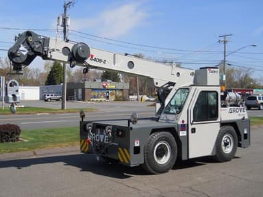 One (1) Used 2012 Grove YB4409-2, S/N: 321700, 9 Ton Capacity Hydraulic Industrial Crane, Equipped With 32’ 10†Three Section Full Power Main Boom; 12’ to 18’ Offsettable Jib; 9/16 Inch Diameter EEIPS Wire Rope; Anti Two Block System; Enclosed Operator’s Cab; Heater and Defroster in Operator’s Cab; Windshield Wiper for Cab; Two Piece Door With Sliding Window; Cab Dome Light; Single Sheave Quick Reeve Hookblock; Headache Ball with Swivel Hook; Hydraulic Oblique Style Outriggers; Independent Outrigger Controls; GM3.0 EFI Gasoline/LP Gas Engine; Spark Arrestor Muffler; Engine Shutdown Feature; 2 Wheel, 4 Wheel, Crab Steer; Front and Rear Pintle Hitch; Dual Rear View Mirrors; Headlight and Taillight Grilles; 10:00 X 15 – 14 P.R. Tires; Amber Strobe Lights; Boom Mounted Work Light Package; Outrigger Monitoring System; Approximate Hours: 12 Hours (5/16/2012)