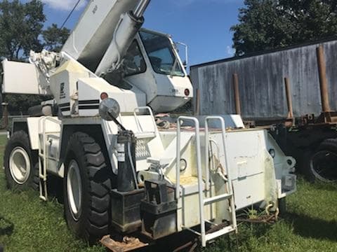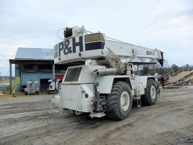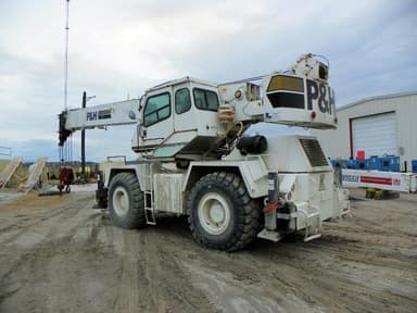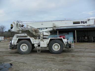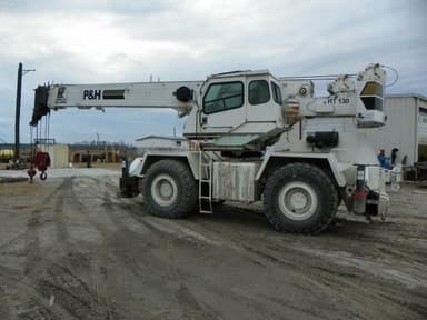 1997 P&H RT130, 30 ton rough terrain crane equipped with: 94 ft. full-power boom,26 ft. side-stow jib, main & auxiliary winches, auxiliary lifting sheave, Greer RCI 510 LMI system, 20.5 X 24 tires, 4 sheave block and ball. Telescope cylinder recently rebuilt and new injector pump.